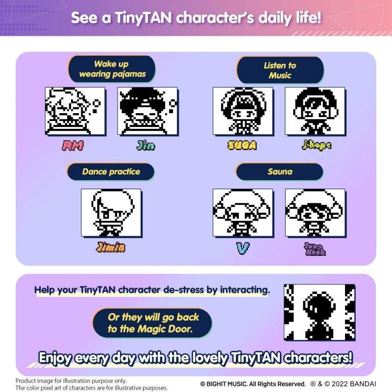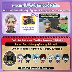 Disfruta todos los días con los adorables personajes de TinyTAN usando una exclusiva versión Black. ¡TinyTAN Tamagotchi abrazado por una adorable figura coleccionable! El TinyTAN HugmyTamagotchi viene con uno de los siete personajes de TinyTAN en forma de figura de vinilo suave, que se puede quitar del dispositivo para exhibirlo. ¡Hazte amigo cercano de los personajes de TinyTAN interactuando con la "Puerta Mágica" y pasando tiempo juntos con este imprescindible nano dispositivo Tamagotchi!