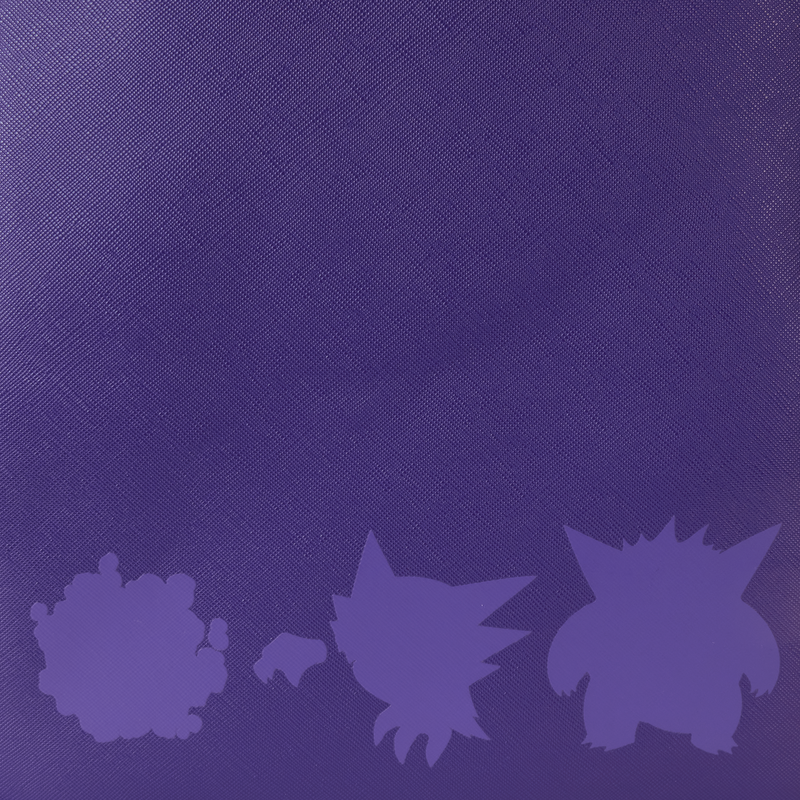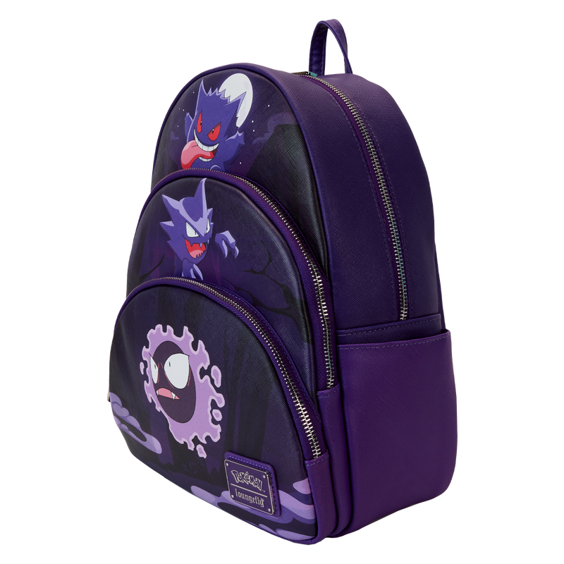 La mochila con tres bolsillos Pokémon Gengar Evolution de Loungefly está hecha de cuero vegano (poliuretano). La mochila tiene correas de hombro ajustables y acolchadas, bolsillos laterales y herrajes de metal plateados. Entre sus características adicionales se incluyen detalles impresos y en relieve. Fíjate en el forro interior a juego.